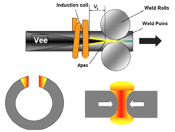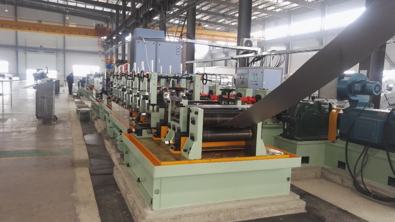 The precise measured strips, precut from high quality HR or CR steel coil strips by slitting line then transfer into the forming section of tube mill, gradually formed into round profile by designed precise roller with open seam along its length in the forming mill. A high-frequency induction welding technology is adopted to seam edge heat fusion and longitudinal seam welding joint by high frequency solid state welder in order to form strong continuous seam joint. The strip is welded continuously in round shape. The welded pipe passes through welding seam cleaning and cooling, then sizing and forming into round or square or rectangular profile with specified tolerance. Finally the welded pipe will be cut to desired and required lengths by cut-off section Finished tubes will be round, square or rectangular shape and bundled.